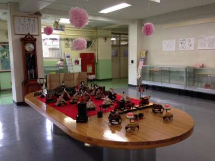 2月も今日で終わり、明日から3月になります。明日は6年生を送る会があり、今週末には謝恩会もあります。6年生は卒業に向けた取組が多くなり、ほかの学年もまとめの学習に入ります。さて、いつものように校内美化ボランティアの皆さんが、素敵な装飾を準備してくださいました。今回は桃の節句にちなみ、ひな人形の飾りです。ありがとうございます。