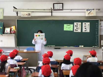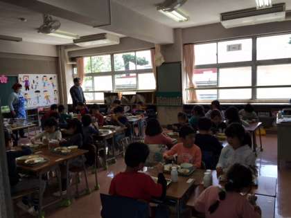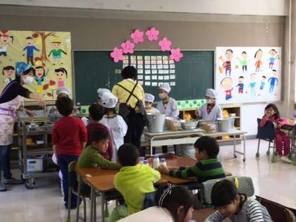 1年生は今日から給食開始です。初めての給食にあたり、栄養士の先生から紙芝居による指導があり、その後給食の準備を行いました。各クラスに給食ボランティアの方がお手伝いに来てくださり、滞りなく給食の準備が整いました。今日飲メニューはカレーライスです。みんなでおいしくいただきました。