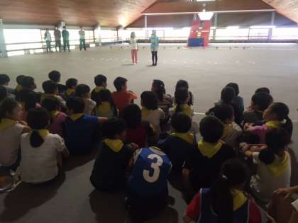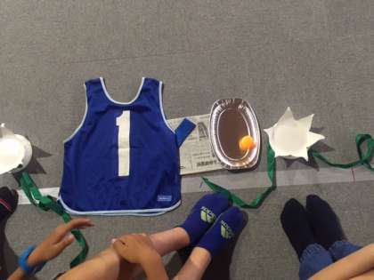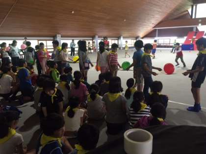 午後は室内レクです。宝さがし、二人三脚リレー、風船運びリレー、カッパリレーの合計点を競います。(宝さがしでは、図工の渡鍋先生が紙粘土で作ったゴキ○リもまじっていました…)大盛り上がりです!!