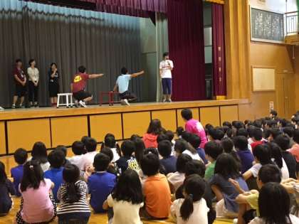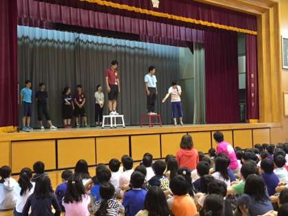 今日の児童朝会では、今週から始まる水泳に向けての全体指導が行われます。プールの入り方の指導を、体育部の先生たちが見本を見せながら指導しました。水泳は命に関わります。しっかりとルールを覚え、きちんと授業を受けてほしいと思います。残念ながら、本日は雨のためプールに入ることはできません。