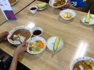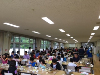 夕食の時間です。食事係が配膳などの仕事を頑張りました。15校が一堂に会して、食堂でおいしいカレーライスをいただきました。