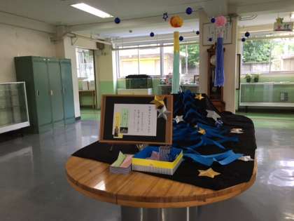 7月になりました。1学期も残りが少なくなってきました。さて、今月も装飾ボランティアの皆さんが、素敵なディスプレイを飾ってくださいました。今月は七夕の飾りです。昇降口には本物の笹飾りも準備してくださいました。ありがとうございました。