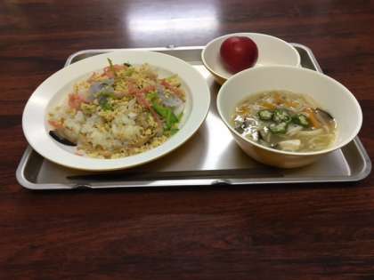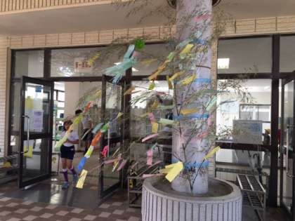 今日は七夕です。大変暑い一日でしたが、今晩は天の川やおり姫、ひこ星を見ることができるでしょうか?さて、今日の給食では、オクラの星がソーメンに浮かぶ七夕汁が出ました。また、昇降口の笹飾りにもたくさんの短冊が付けられています。願いごとが叶うといいですね。