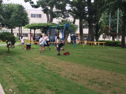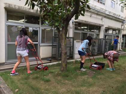 暑い季節になり、クローバー園の芝生もどんどん伸びます。芝生の手入れが必要です。そこで、理科委員会の子どもたちが朝芝刈りをしてくれています。芝刈り機を交代で使い、伸びた芝を刈っています。なかなか上手に刈れています。理科委員会の皆さん、これからもよろしくお願いします。