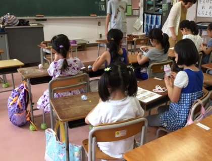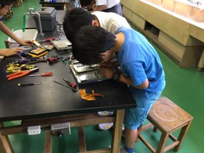 3日目の午後の講座もバラエティに富んでいます。「フラワー壁掛け」「オリジナルブレスレット」「お花モチーフ」「トートバック」などの手芸、「器械運動」「気功遊技」など体を使うこと、「アロマ」や「PCの分解」「自由研究」「おやつ作り」など、全部で14の講座が開かれました。手芸などでは、子どもたちはすてきな作品をつくり、うれしそうに持ち帰っていました。
