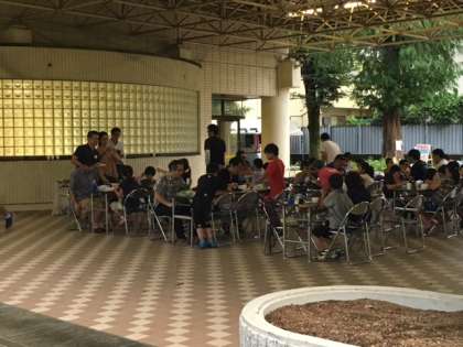 おいしいカレーライスができあがり、みんなで夕ご飯です。ピロティでいただきます。雨は小降りになってきました。