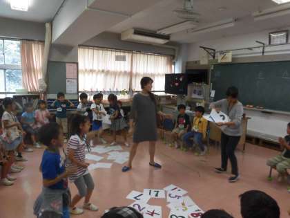 1学期に習ったあいさつの表現を使ってあいさつしたり、今回新たに習った数字の読み方を学んだりしました。1〜20までの数字の読み方をイギリス出身のソフィア先生から習い、数字見つけゲームを行いました。