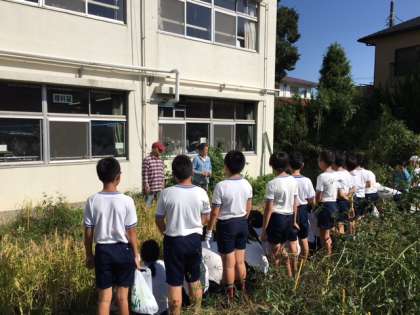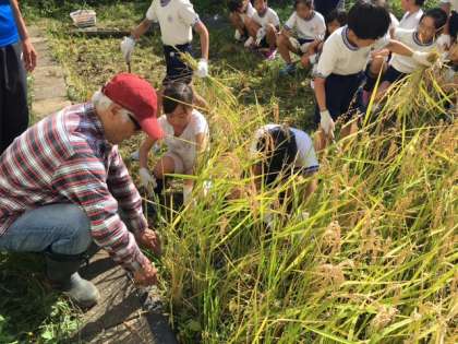 5年生は総合的な学習で、稲を育てています。理科園の田んぼでは今年も稲が立派に実りました。今日、地域ボランティアの方をゲストティーチャーにお招きし、稲刈りをしました。全体で指導を受けた後、一人ずつ稲刈り用の釜を使って稲を刈り取りました。おっかなびっくり作業をしている子もおりましたが、子どもたちにとってよい経験になったようです。ありがとうございました。