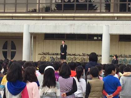 10月初旬からの4週間の教育実習も終わり、本日児童朝会で教育実習生が全校児童にあいさつをしました。1年1組で4週間を過ごし、教職の勉強に一生懸命取り組んでいました。将来はぜひすてきな先生になってほしいと思います。