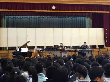 今日は祖師谷小学校の開校記念日、74回目の誕生日です。今週は開校記念ウィークとして、開校記念集会や開校記念もちつきなども行われます。今日は、ピアノとパーカッションの演奏者をお招きし、色々な打楽器の演奏を聴かせていただきました。演奏を聴くだけでなく、手拍子で一緒に参加したり、演奏に合わせて歌を歌ったりしました。全校で贅沢な、素敵な時間を過ごすことができました。演奏者の皆さん、ありがとうございました。