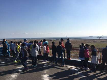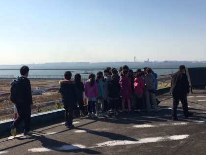 埋立処分場の中の展望台に来ています。埋め立て作業の様子を見学しています。風がとても強いです。