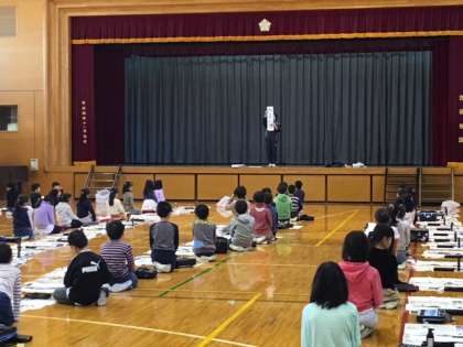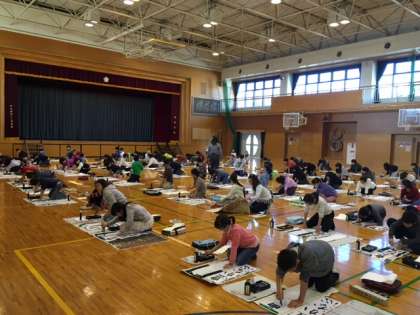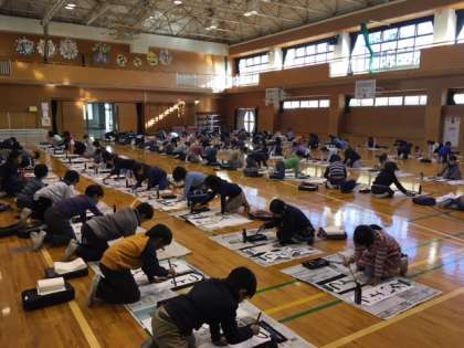 3学期が始まり、この2日間いろいろな学年で新年恒例の書き初めの授業が行われています。学級ごとに教室で行っている学年もあれば、体育館で学年全員で行っている学年もあります。昨日は5年生、今日は3年生が体育館で書き初めを行いました。どちらの学年の子どもたちも、少々冷たい空気の中で正座をして大きな半紙に向かい、しっかりと集中して取り組んでいました。皆、元気のよいすてきな作品を仕上げていました。ぜひ、来週から実施する書き初め展をご参観ください。