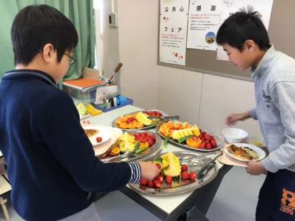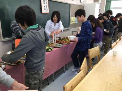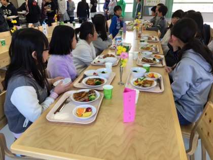 6年1組の今日の給食はバイキング給食でした。6年間でたった1度だけのスペシャルな給食です。多目的室(ランチルーム)の配膳台には色とりどりの主菜や副菜、デザートなどが並び、子どもたちもワクワクしながら選んでいました。どのグループも和やかに食事が進み、たくさんの子どもたちが何度もおかわりをしていました。卒業前の楽しい思い出がまたひとつ増えました。