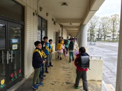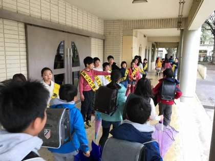 新年度最初のあいさつ運動がありました。初日は5年1組と2年1組です。雨の中でも、元気よくあいさつする子どもたちの声がたくさん聞こえました。