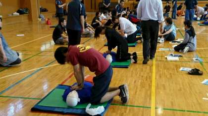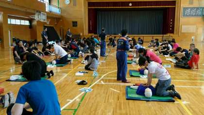 体育館にて、塚戸小学校と合同で講習会を行いました。水泳指導が始まる前に行っています。心臓マッサージや人工呼吸、AEDの使い方などを学びます。万が一がないことを願いつつ、万が一に備えて学んでいます。