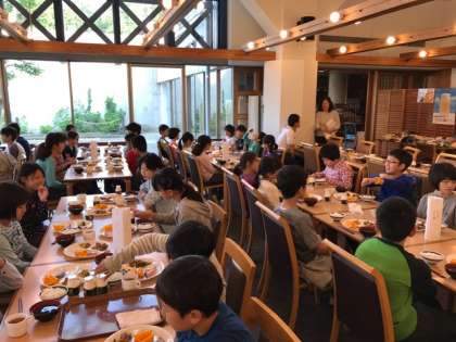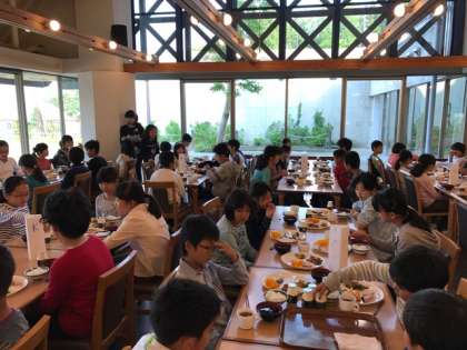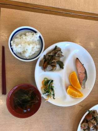 朝会の時間です。食事係がみんなの食事を準備してくれました。今朝は和食メニューです。