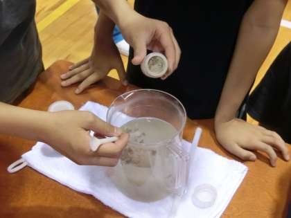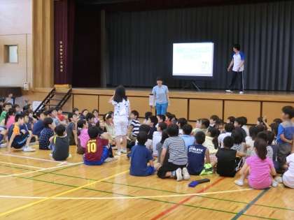 今日の5、6時間目に体育館で東京都水道局員による出張授業がありました。水道水はどのようにしてきれいになっていくのか、説明や実験を通して学習しました。実験では、班の友達と協力して楽しく学習することができました。