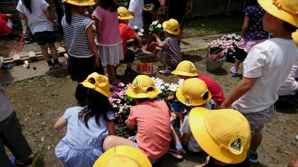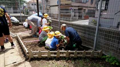 地域の農家の方々に教えていただきながら、お花を植えました。農家の方々との交流は、普段なかなかできないことなので、子どもたちにとって貴重な経験になりました。
