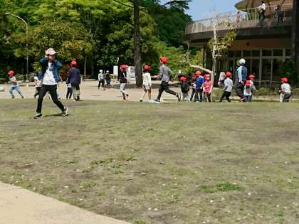 お弁当、おやつタイムが終わって、もう一遊びです。青い電車に乗ったり、鬼ごっこをしたり元気いっぱいです。