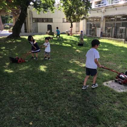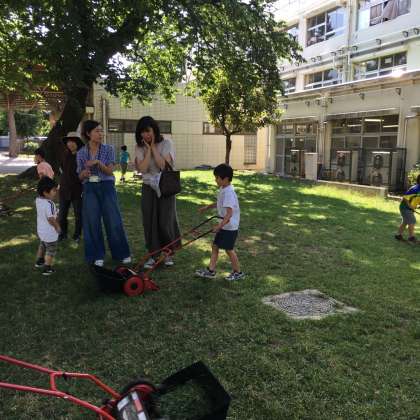 今回は、2年3組チームです。2年生は、芝かりが2回めの子も多く、簡単な説明ですぐに作業に取り組んでいました。暑い一日でしたので、日かげのところを中心に約30分間作業をしました。芝がのびすぎて、芝かり機でかれないところもあり、それに気が付いた保護者の方が、かまをつかって手入れしてくださいました。