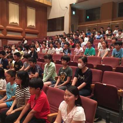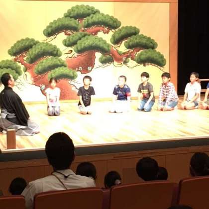 日本の伝統芸能のひとつである狂言の世界を体験して、『附子』という演目を鑑賞しました。台詞の言い回しに笑いながら、みんなで体験し、想像力を働かせながら、演目を鑑賞しました。
