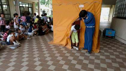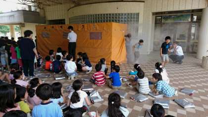2時間目に避難訓練があり、その後に2年生と5年生は、テントの中に入って煙体験をしました。