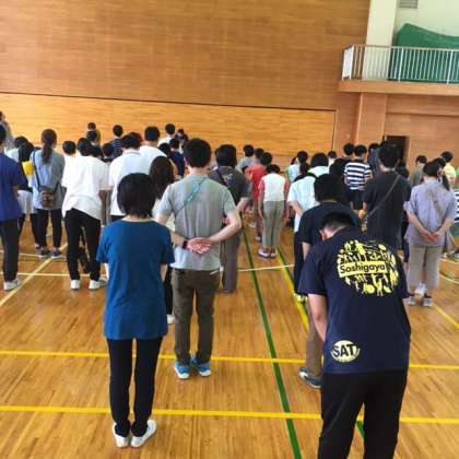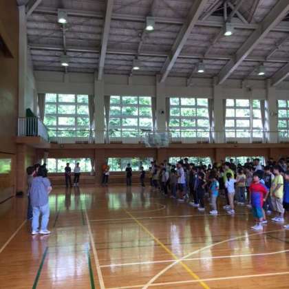 避難訓練で体育館に避難し、そのまま開園式を行いました。キャンプファイヤーやレクレーション、食事など区内小学校の約130名と一緒に生活します。