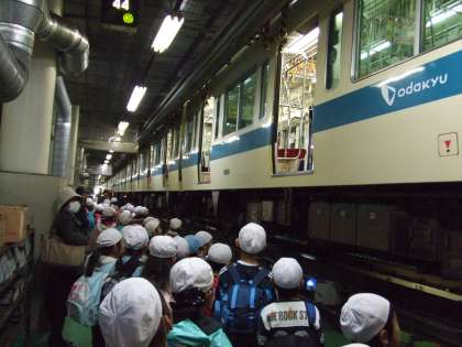 また、ロマンスカーMSEに乗り、電車の洗浄も体験しました。初めての体験に大興奮でした。小田急線の電車について、たくさん質問もしてきました。