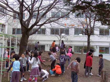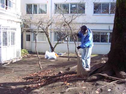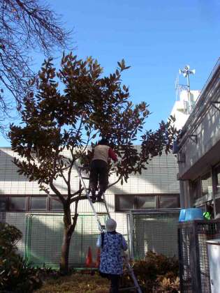 職員室の前には、泰山木があります。常緑樹なので青々とした大きな葉をたくさんつけています。室内を暗くしてしまうため、枝を落とされスリムになりました。おかげで、職員室には日がよく差し込むようになりました。ストーブを使う時間が減り、CO2の削減にもなりそうです。泰山木さん、ごめんなさい。