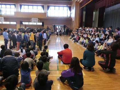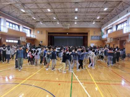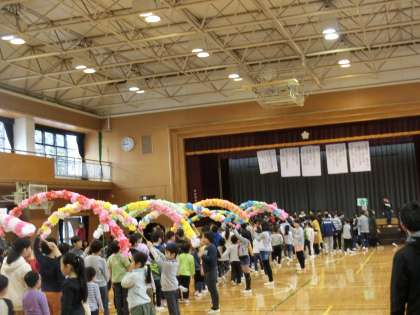 1年生のなかには、初めて全校児童の前に出て緊張している子もいましたが、3年生の出し物や全校でのじゃんけん列車、歌を通して、みんなが優しく、温かく迎え入れていました。