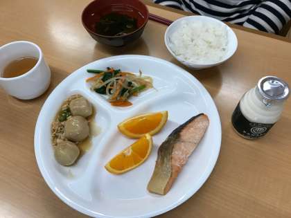今日の朝食メニューです。たくさん食べて、登山に備えます。川場村の飲むヨーグルトが付きます。