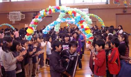 花のアーチをくぐって、笑顔で6年生が入場し、会が始まりました。まず、各学年から、出し物等のプレゼントです。1年生は「歌えバンバン」・2年生は「君とぼくの間に」の合唱を、3年生は「思い出のアルバム」のリコーダー演奏、4年生は「6年生との思い出をまじえた寸劇・クイズ・ダンス」とペン立てを、そして、5年生は「組体操・AKB48のダンス」、ぽぷら学級は「ナミナミナのダンス」を6年生に贈りました。