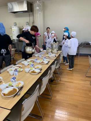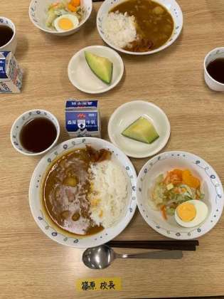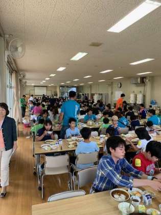 お風呂に入り、1日目の夕食です。15校のみんなが食堂に集まり、一緒に「いただきます。」をしました。
