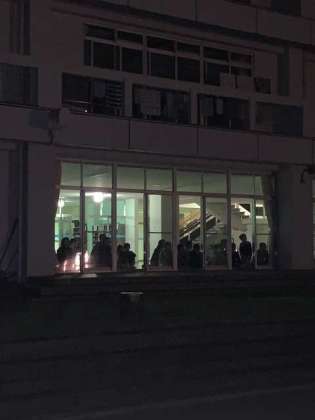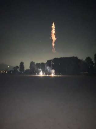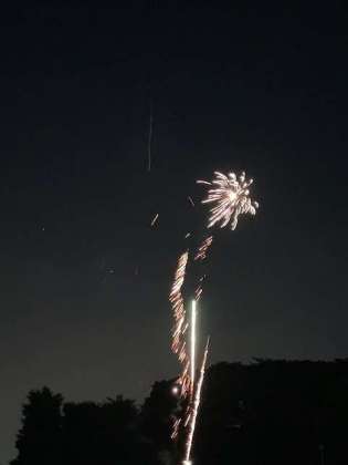 火の消えていくのを静かに見つめて、キャンプファイヤーが終わりました。宿舎のロビーから花火を見ました。