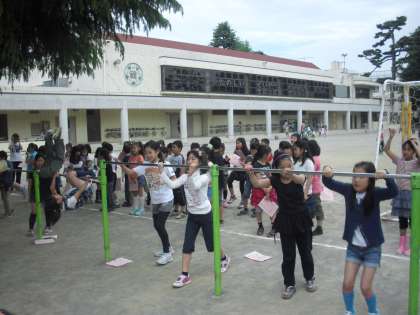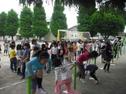 体育委員の5・6年生が鉄棒カードの出来た技にシールを貼るのも、子どもたちをやる気にさせたようです。