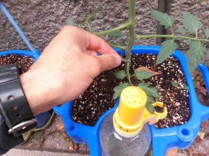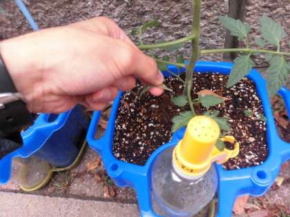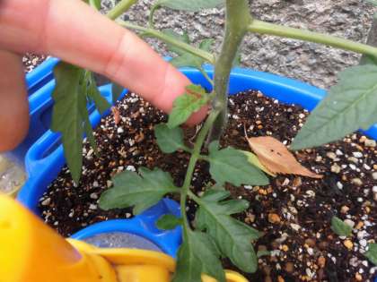 2まい目のしゃしん:わき芽(め)をつまんで、よこにひっぱります。