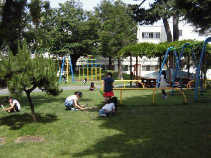 1年生は、校庭を探検していました。