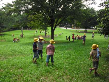 虫を見つける子、草の上をごろごろ転がる子、だるまさんころんだをする子など大勢いました。