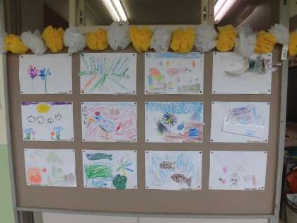 1年生の教室の廊下の壁には絵の具を使った作品が掲示されています。