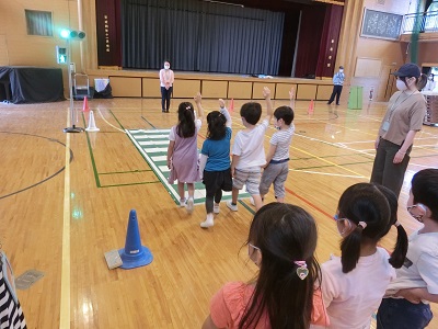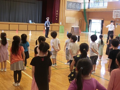 横断歩道や「止まれ」の標識、車に見立てた跳び箱