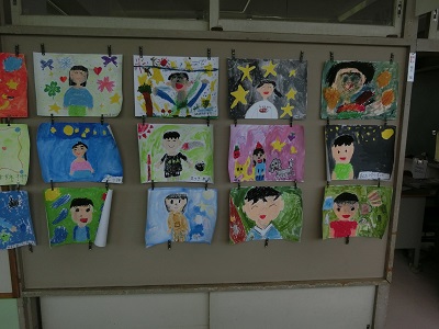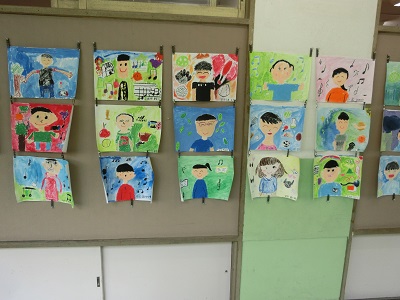 自分の顔と、好きなものをクレヨンと水彩絵の具を使って