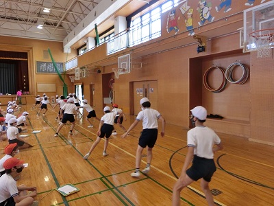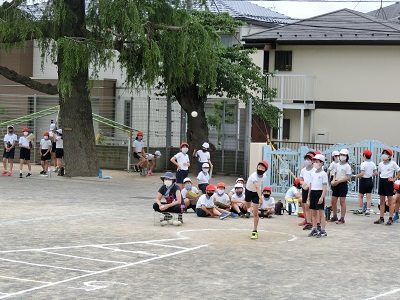 校庭では、暑い陽差しの中、ソフトボールの回収作業にも