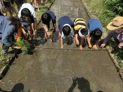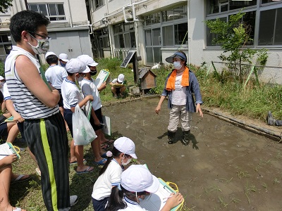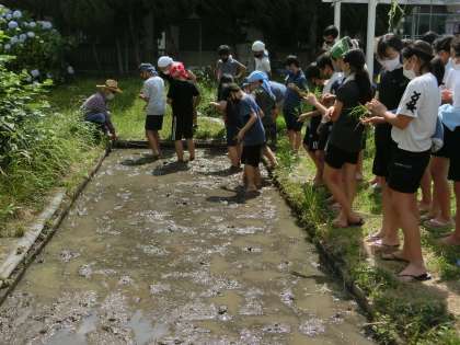 5年生が理科室裏の田んぼに田植えの体験をしました。