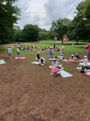途中、雨が降りましたが、やり過ごし、スタンプラリーを再開。前半を終了して、おやつタイムです。マスクを外して、黙々と食べています。