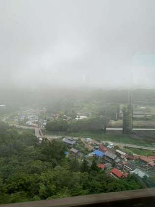 バスは、埼玉県から群馬県に入りました。標高が高くなり、霧がかかって遠方の山々は見えません。