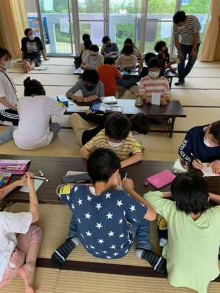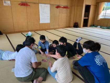 お風呂に入り、部屋でゆったり過ごしています。男の子は、ふた部屋に分かれて過ごします。ひと部屋は、36畳あり、子ども7人大人3人で使います。カードゲームをしたり、葉書を書いたりしてすごしました。5時50分から夕食です。