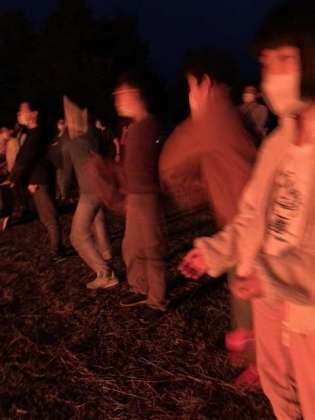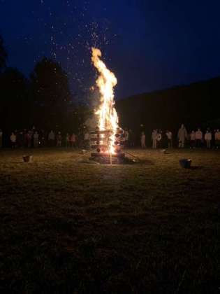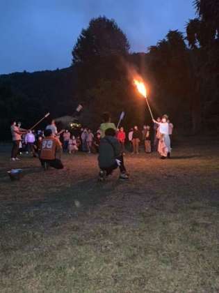 火の神様による点火式。燃え盛る炎を囲んで歌やダンスで大いに盛り上がりました。