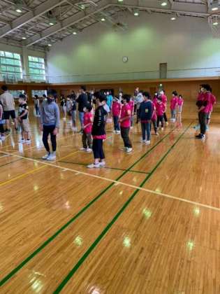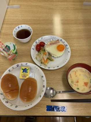 園庭がぬかるんでいたので、体育館で朝会をしました。ラジオ体操で目を覚まします。朝食は、パン、ベーコンエッグ、サラダ、クリームシチューです。たくさん食べて今日一日も頑張ります。