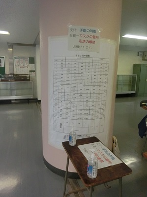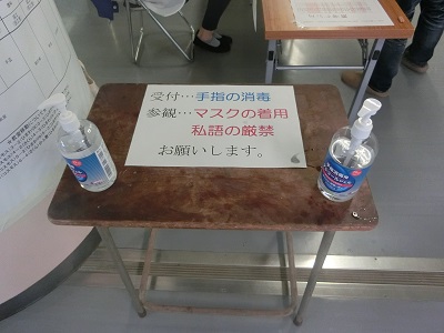 受付での手指消毒、