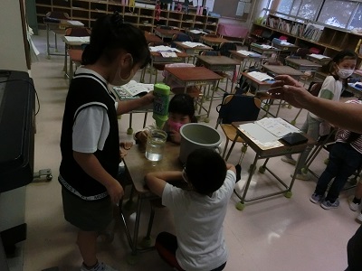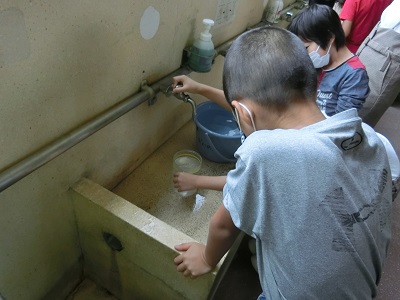 バケツに水を汲んで、いろいろな容器に水を入れ替えて